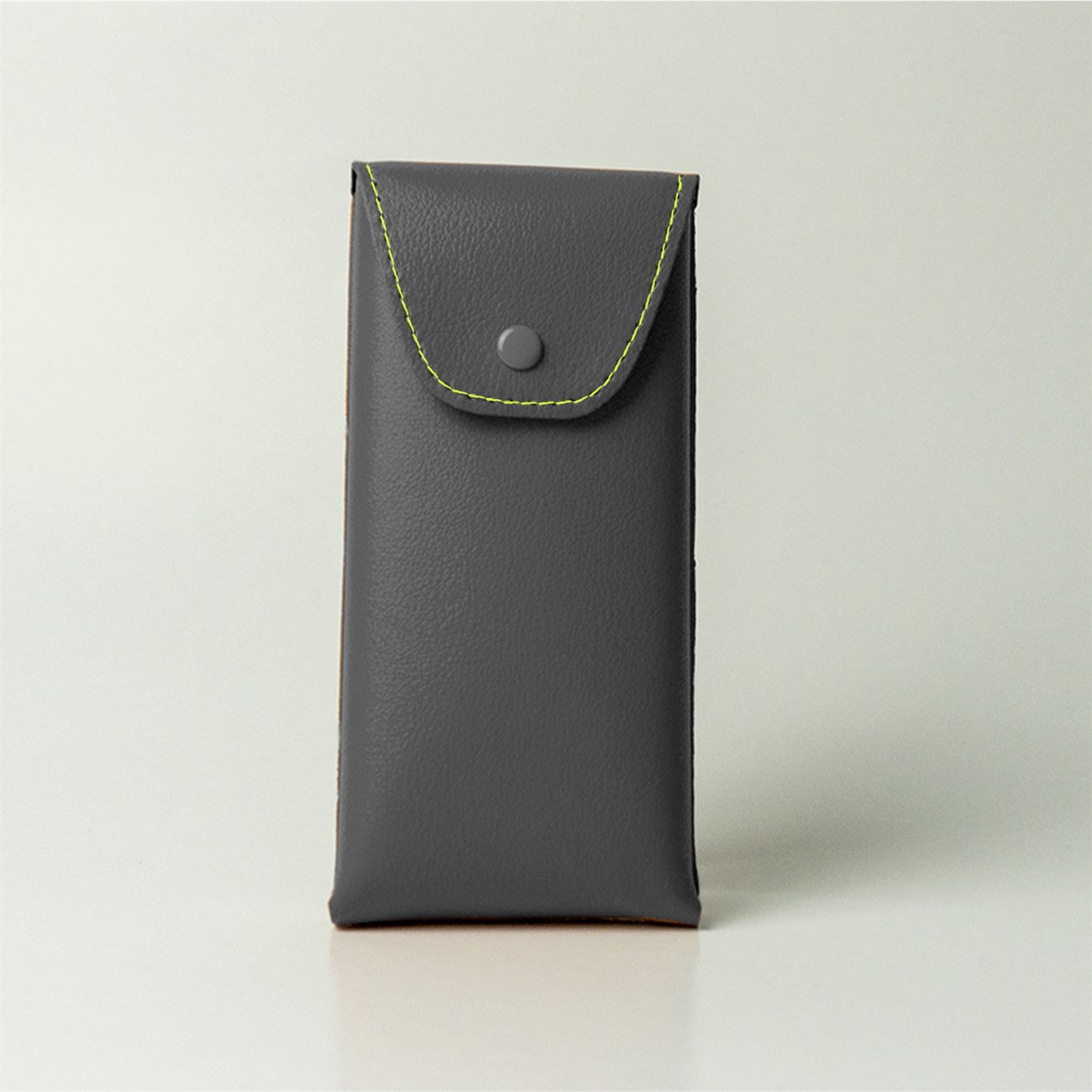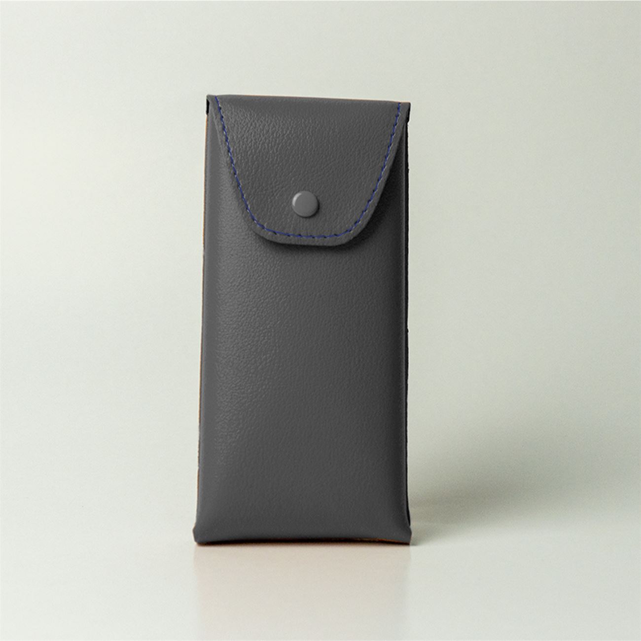 Dimensioni mm 75x155x20. Astuccio maschile per occhiali da vista, con vaschetta interna, chiusura a patella con bottone a pressione.