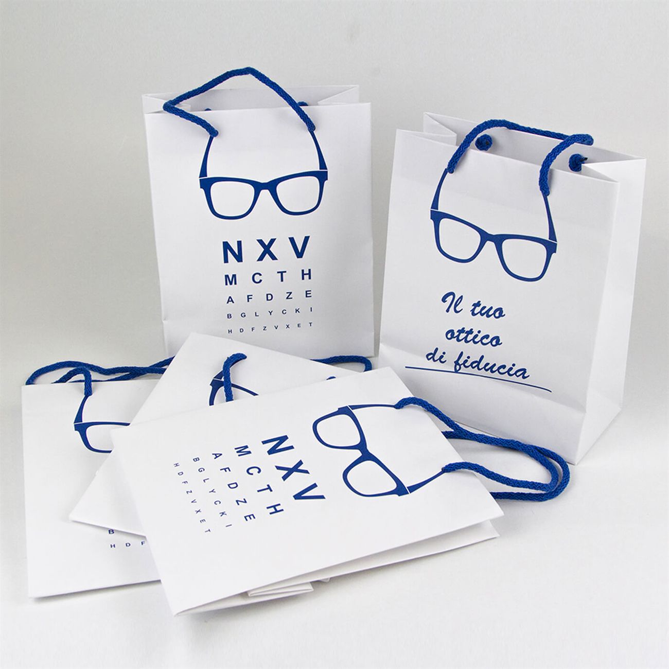 Shopper in carta plastificata opaca con stampa Ottotipo in Blu, non personalizzabile.