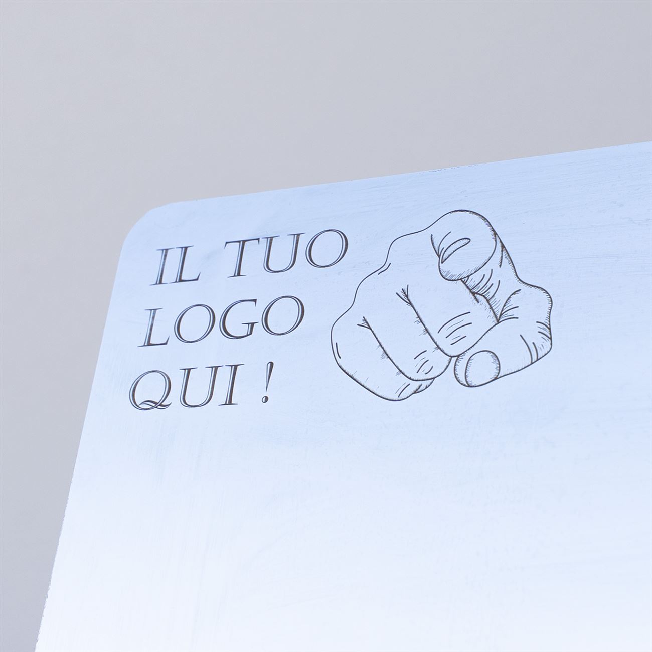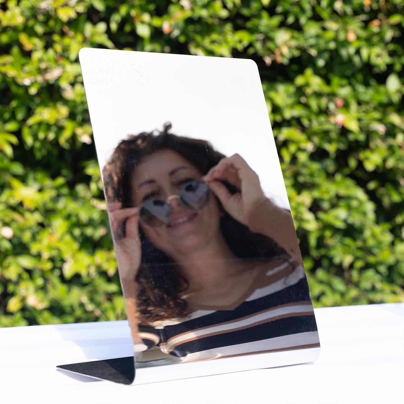 Leggerissimo specchio da banco in acciaio inox , dimensioni cm. 25x38 personalizzabile a laser con Vostro logo. Completamente infrangibile.